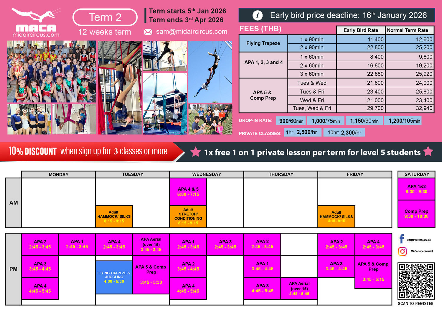 - Aerial Private Class Package: 2300Bt/hr (10 hrs. paid in advance)